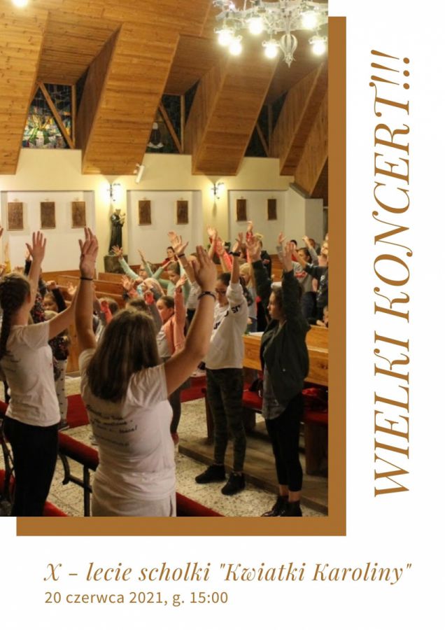 Już do 10 lat scholka "Kwiatki Karoliny" swoim śpiewem, grą i ewangeliczną radością, ubogaca liturgię mszy świętych o 11:00 oraz wiele wydarzeń z życia naszej wspólnoty parafialnej.